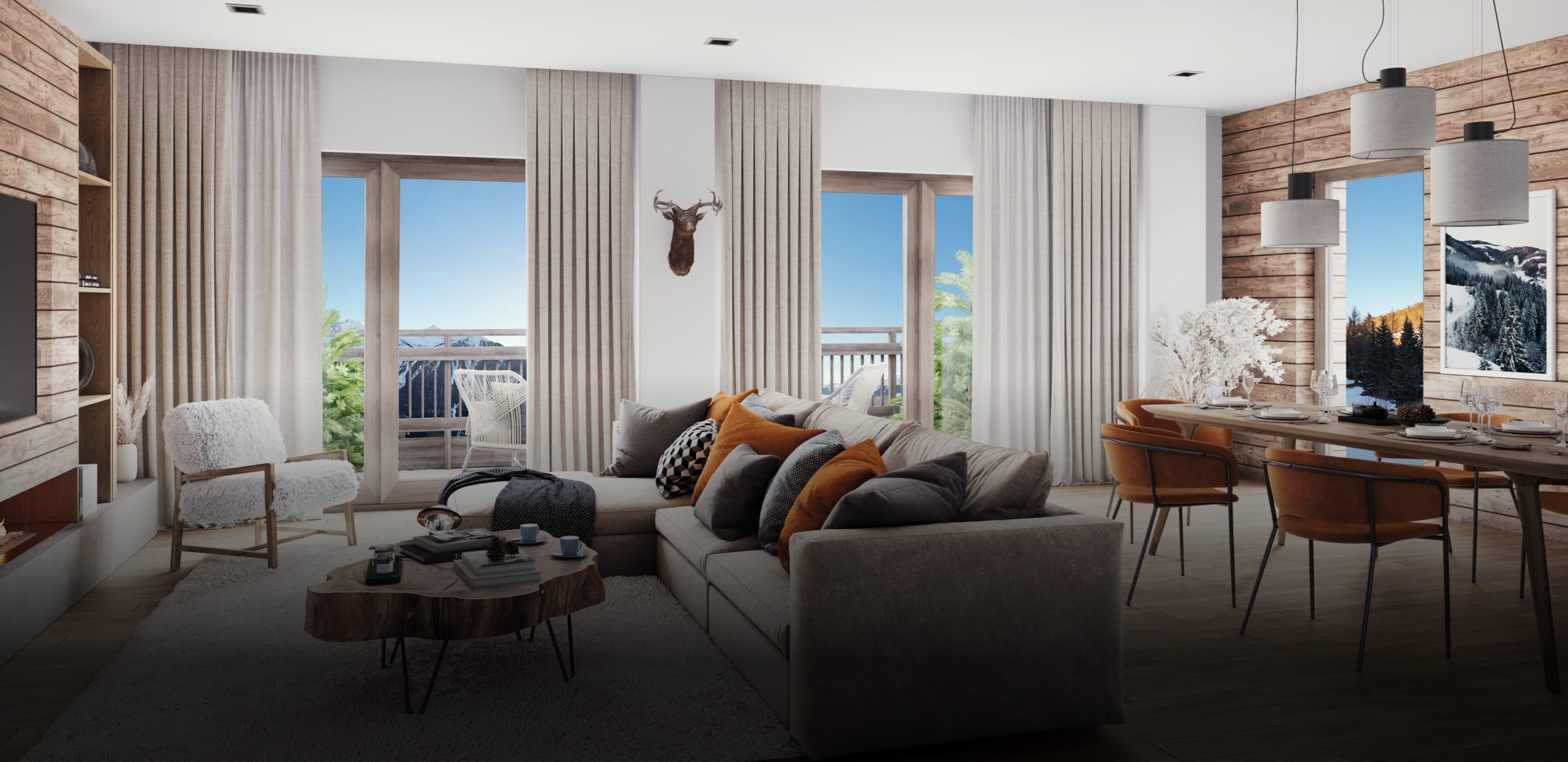 La conception de la résidence Le Carré des cimes repose sur une attention minutieuse à chaque détail. Des appartements de 4 à 6 pièces expriment le souci du confort et du bien-être toute l’année. Les équipements et finitions sont soigneusement choisis, privilégiant les espaces de vie spacieux pour des moments inoubliables en famille ou entre amis. Les duplex aux derniers étages offrent des pièces de vie équilibrées, mettant en valeur les poutres de la charpente. Les larges baies vitrées dévoilent un panorama exceptionnel sur la station et les massifs